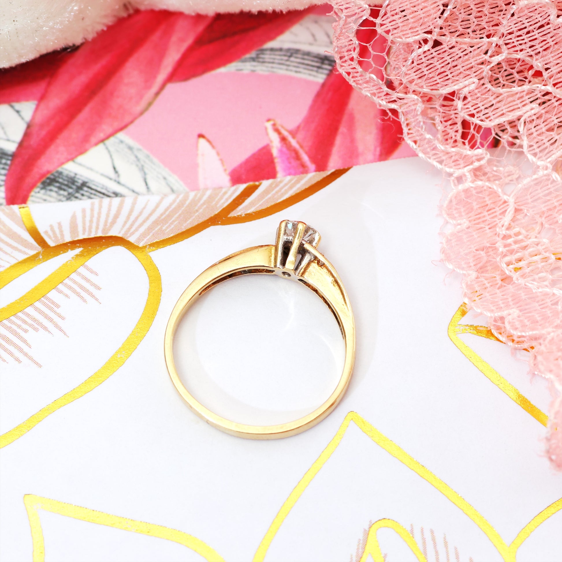DESCRIPTION: A pretty vintage 1980’s solitaire Diamond engagement ring set with a single Brilliant-cut Diamond upon an 9ct yellow Gold band. In a sweet crossover style, with three sparkles to each shoulder it dates to 1988 with a London hallmark. A lovely choice for a vintage jewel lover!