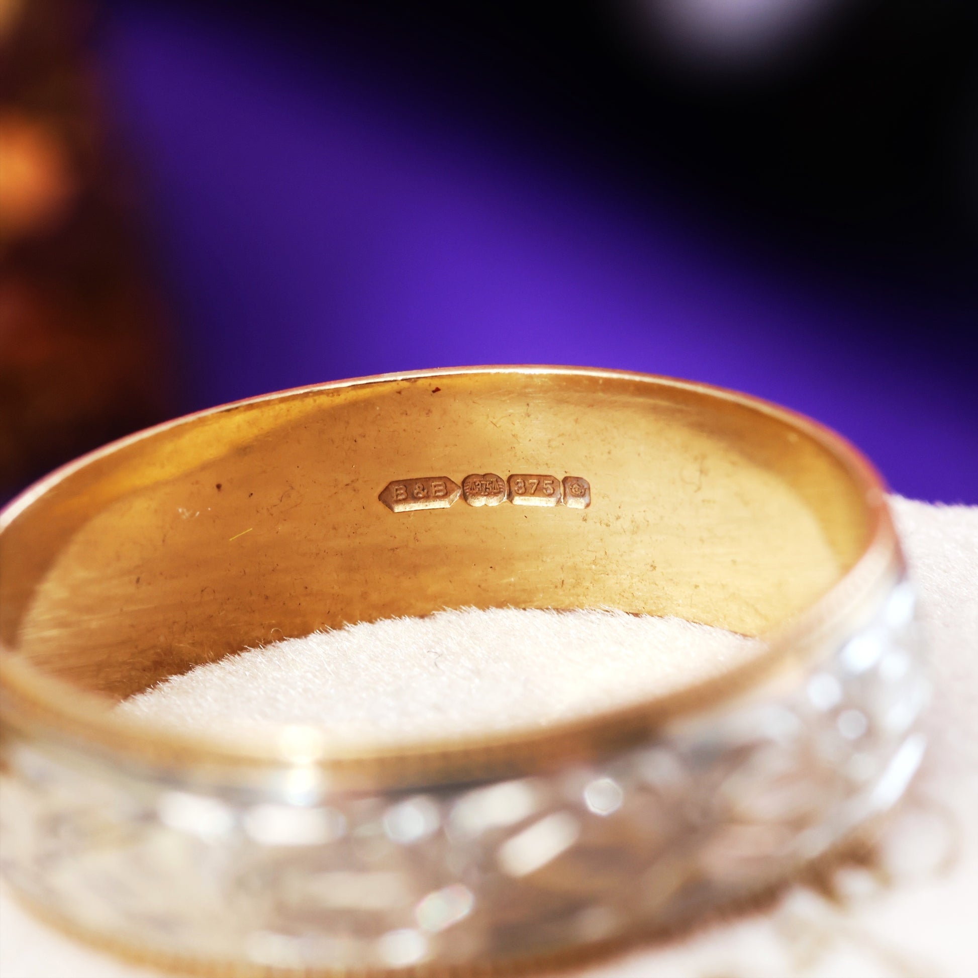 DESCRIPTION: A lovely two colour 9ct Gold band engraved with a continuous design of flowers around the White Gold centre, with Yellow Gold beaded edges.