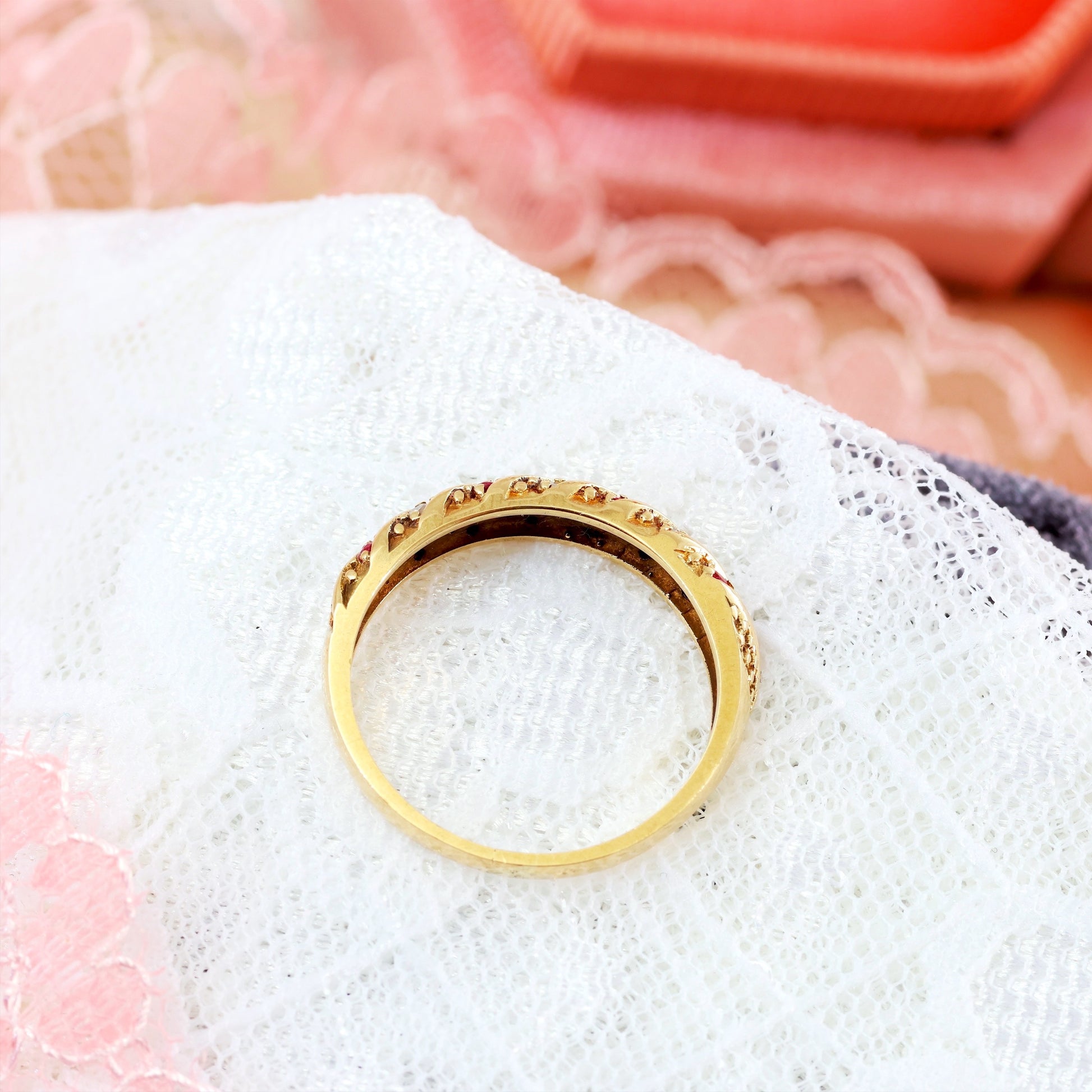 DESCRIPTION: A vintage Diamond and Ruby dress ring set with nine bright Diamonds and nine Rubies in a tapered 9ct yellow Gold band.