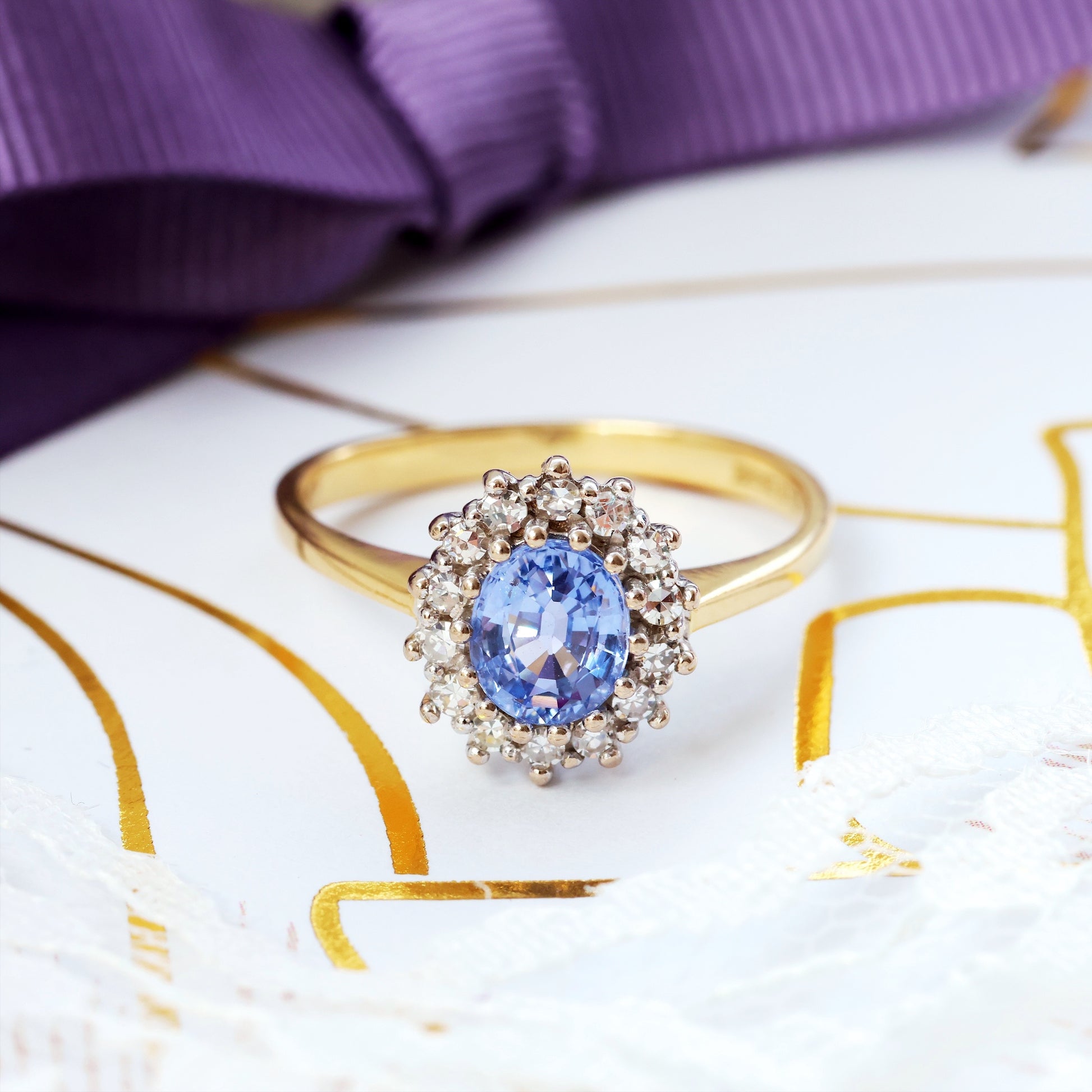 DESCRIPTION: A vintage Diamond Ceylon Sapphire cluster ring of a lovely quality. The lilac/blue Sapphire is beautiful and clear, framed by twinkly Brilliant-cut Diamonds. Fully hallmarked in London (marked inside the shank) in the late 1980’s.