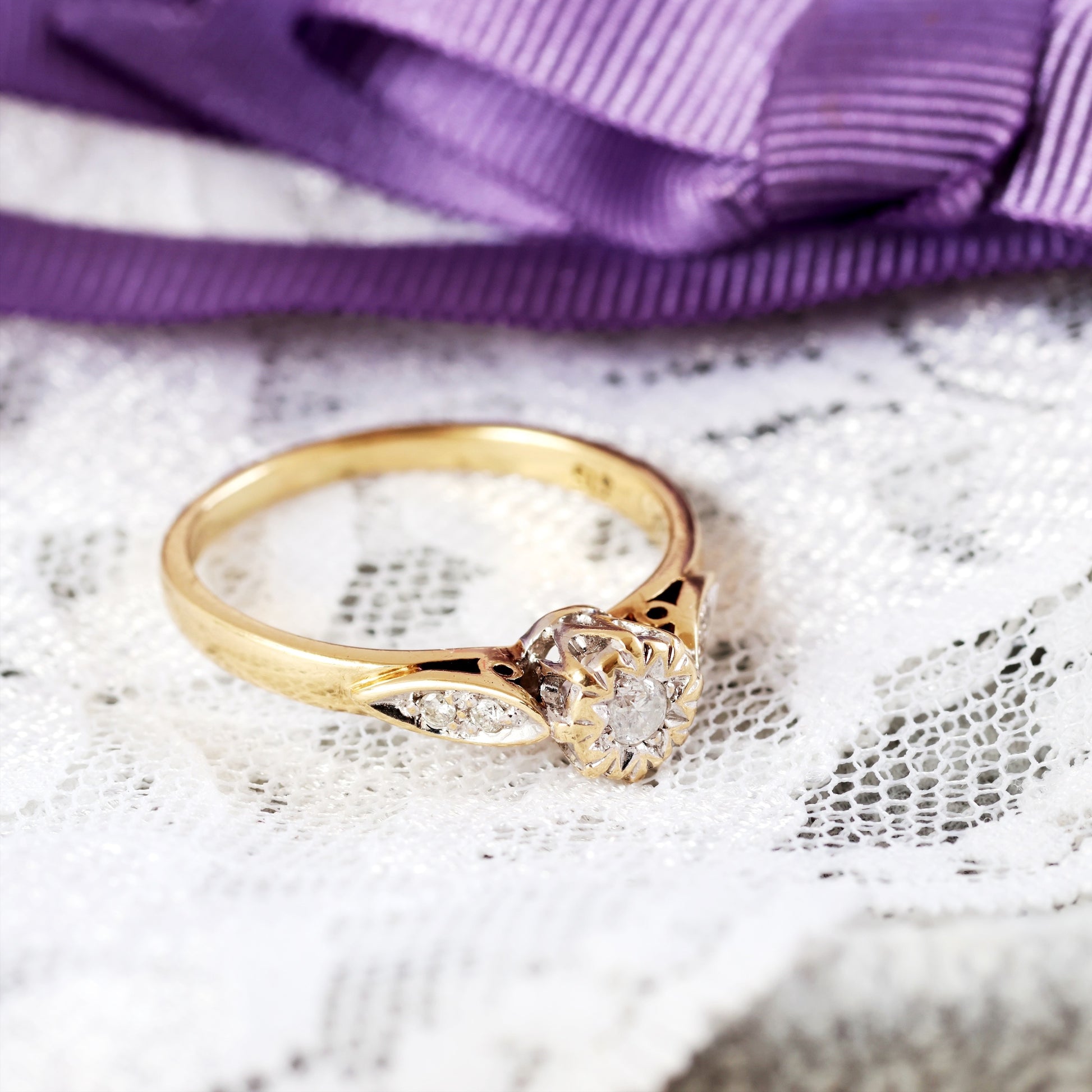 DESCRIPTION: Circa 1980’s, a sweet vintage solitaire Diamond engagement ring set with a Brilliant-cut Diamond in a White Gold starred setting upon an 9ct yellow Gold band. Pretty Diamond accents to each shoulder make it a lovely choice for a vintage jewel lover!