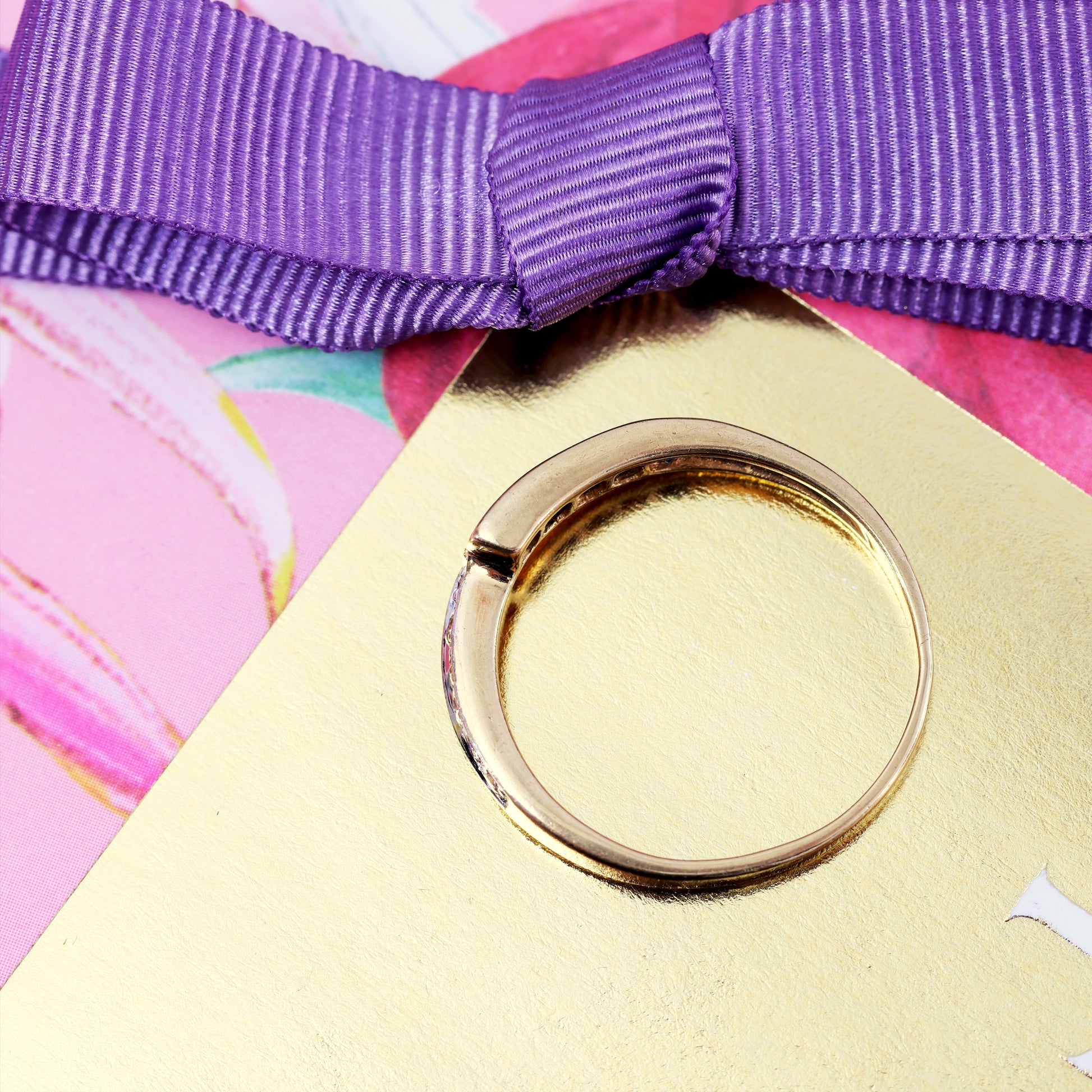 DESCRIPTION: A vintage Sapphire and Diamond dress ring set with five bright blue Sapphires and six glittery Diamonds in an offset 9ct yellow Gold band. Tastefully different and stylish in its simplicity, this would be a great choice for a vintage jewel lover!