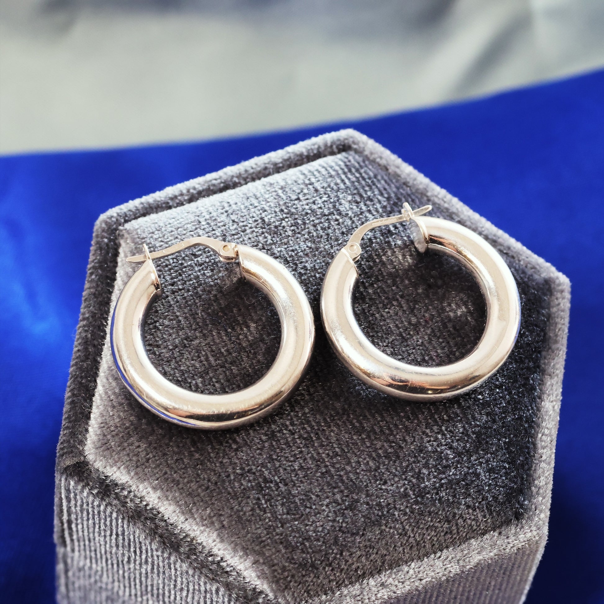 DESCRIPTION: A super-sassy pair of vintage 9ct Gold hoop earrings with lovely secure fittings and nicely light to wear but with a bold and confident look. They have a full London hallmark for 9ct Gold applied in 2004.