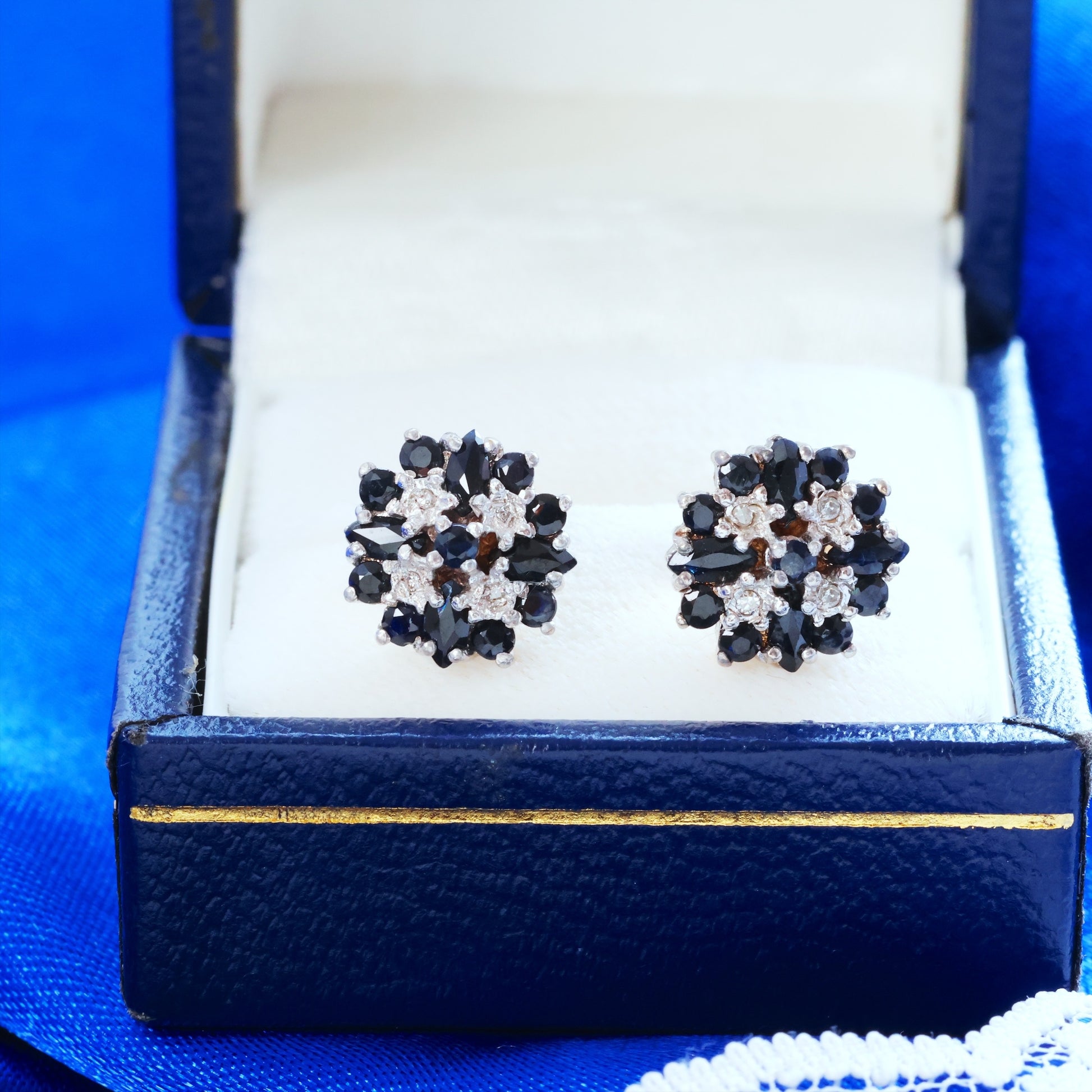 DESCRIPTION: Beautiful vintage flower cluster earring studs set with inky blue Sapphires and twinkly Diamonds between. Fully hallmarked at the Birmingham Assay Office in 1991.