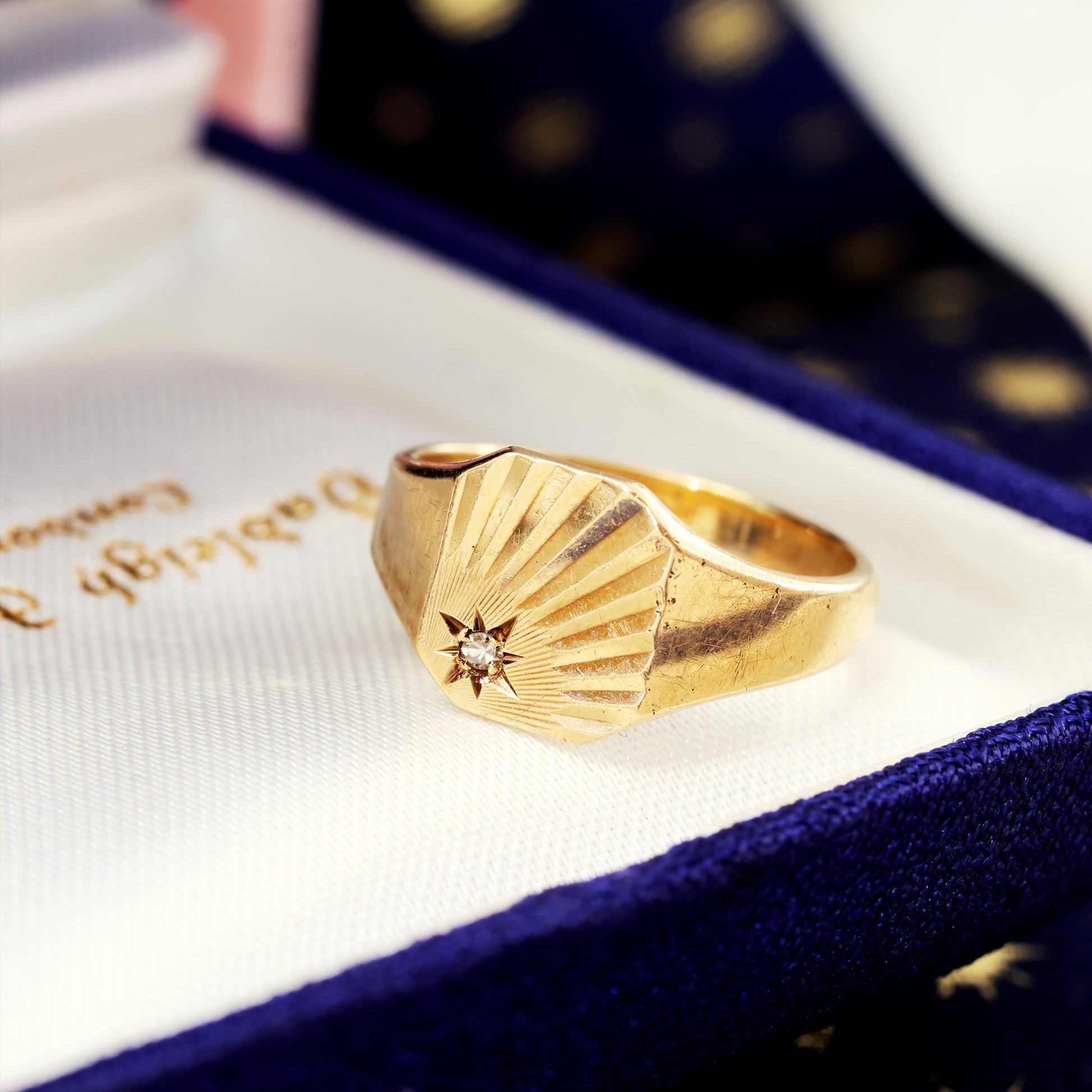 DESCRIPTION: A sweet 9ct gold sunrayed pinky or signet ring set with a tiny sparkle of Diamond. Dates to 1994.