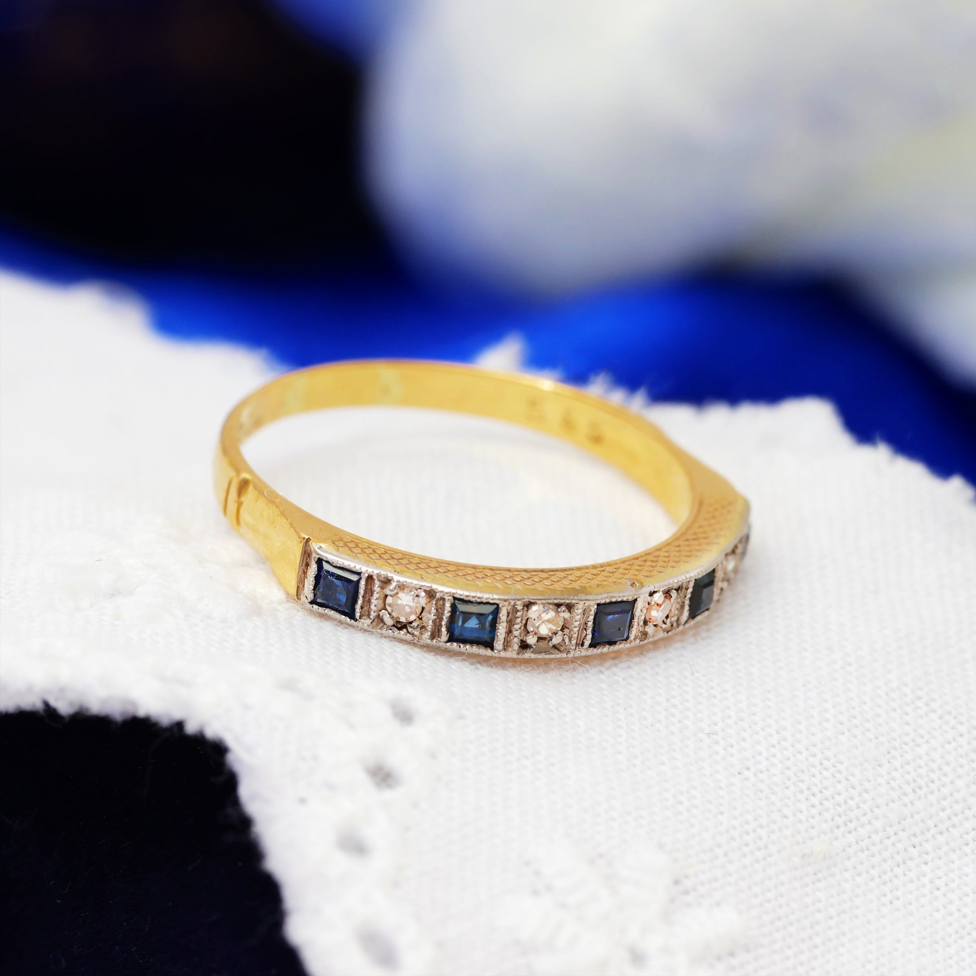 DESCRIPTION: A lovely half eternity style band set with five square cut sapphires and four cute Diamonds. In 18ct Gold with a platinum setting. Dated to 1964.