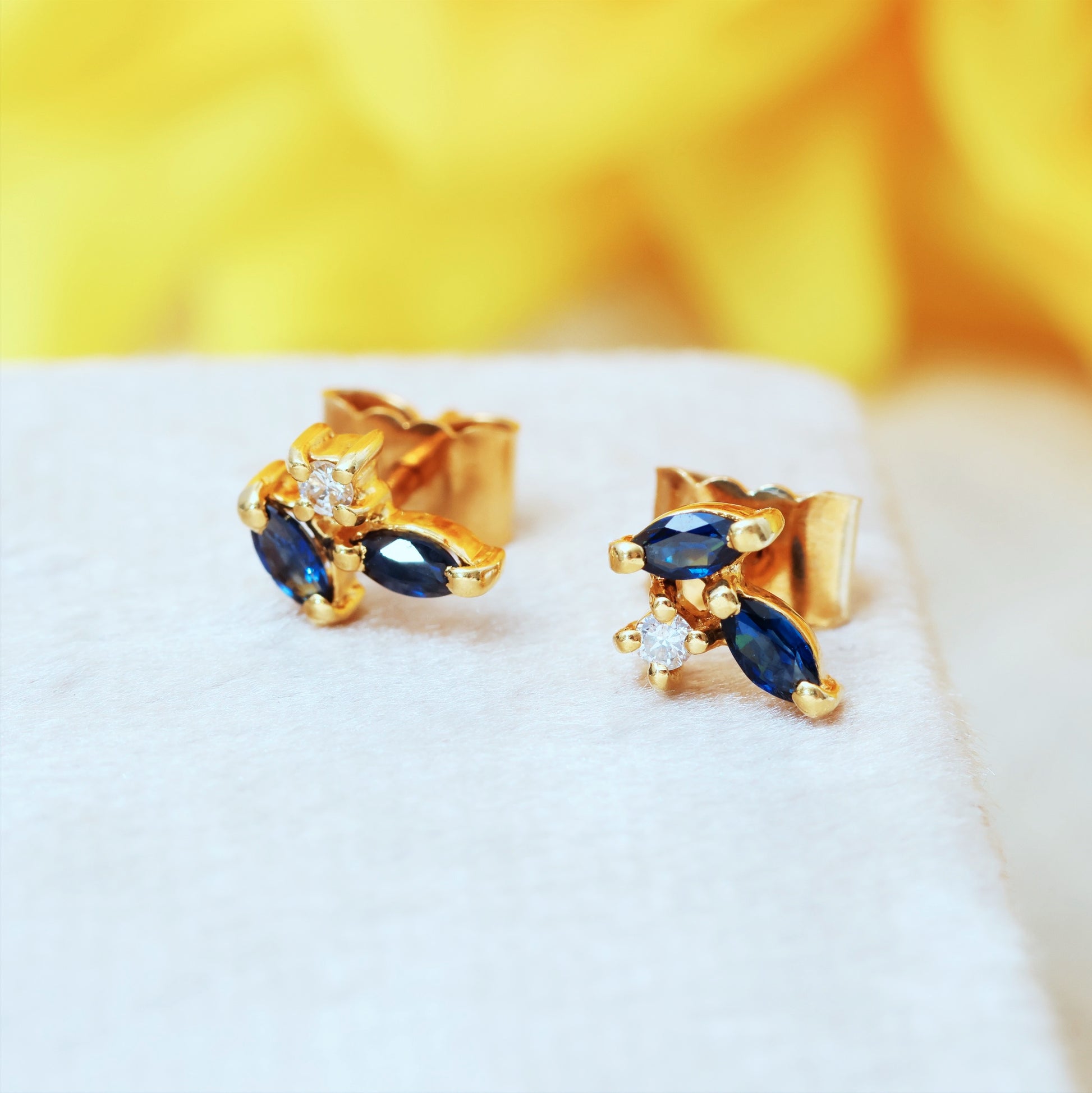 DESCRIPTION: An alluring pair of vintage 1980's Sapphire and Diamonds stud earrings. A pretty asymmetric design with brilliant Diamonds and Midnight Blue Sapphires in 18ct yellow Gold (marked to the backs) and of Italian origin.