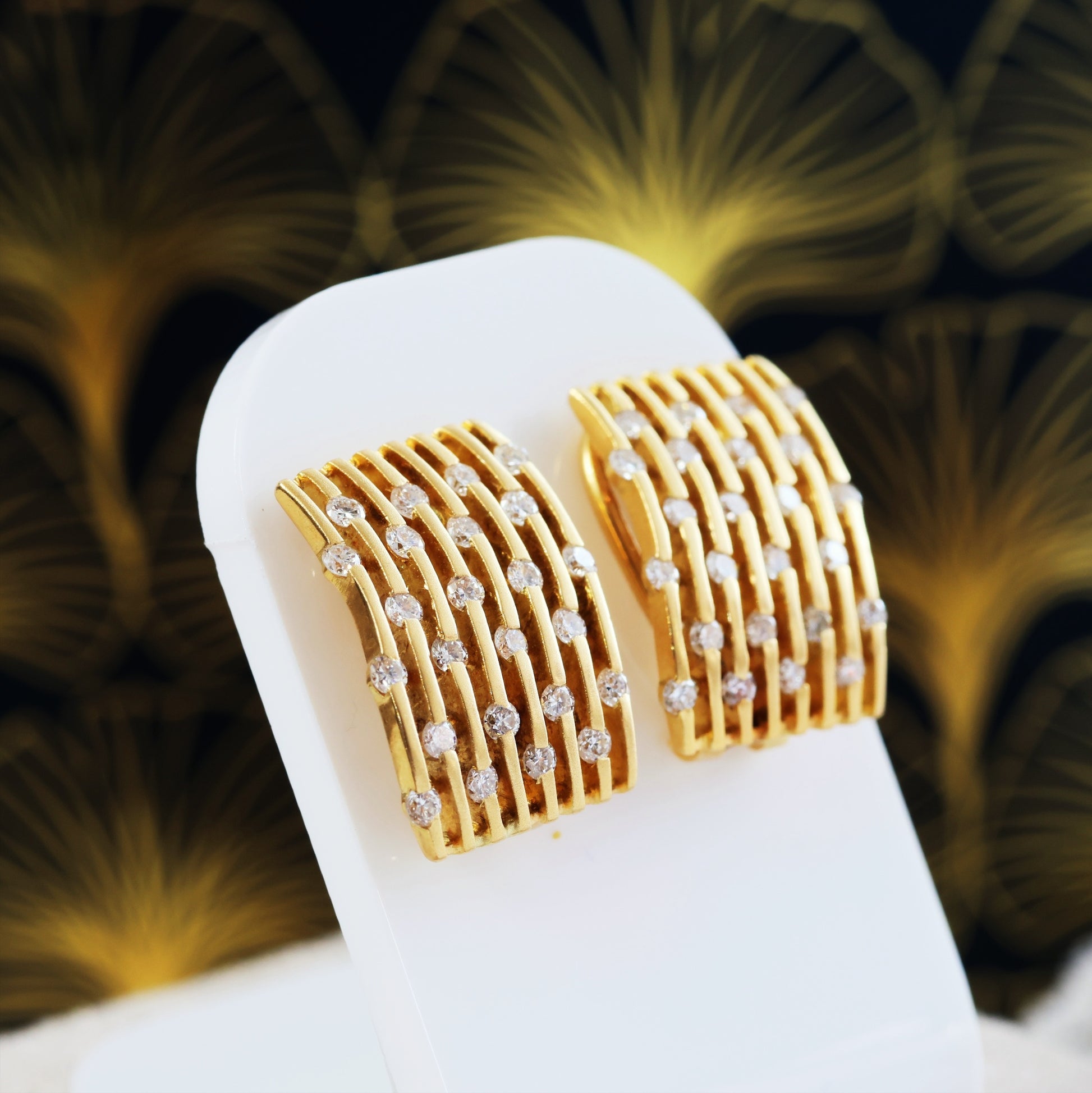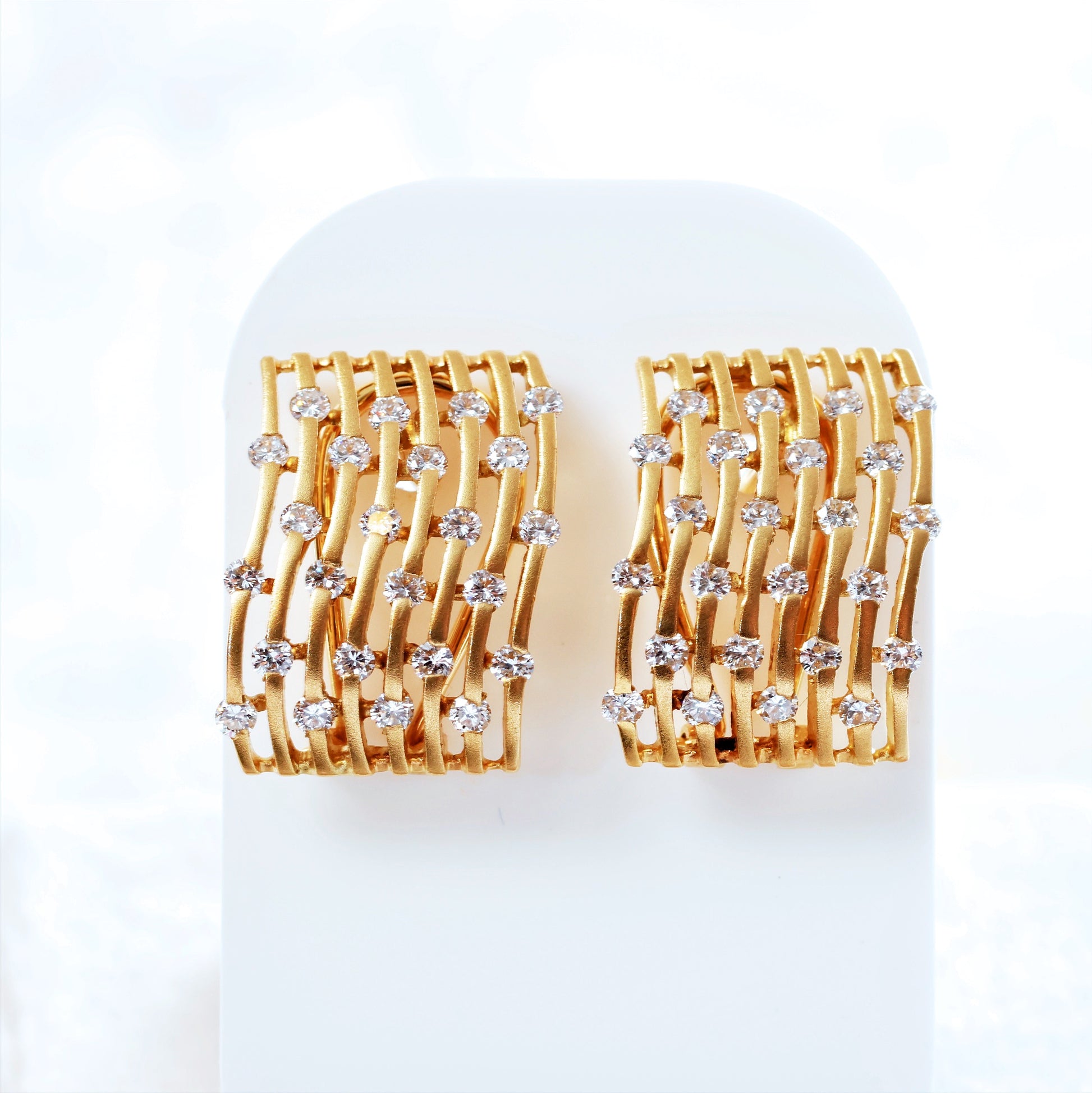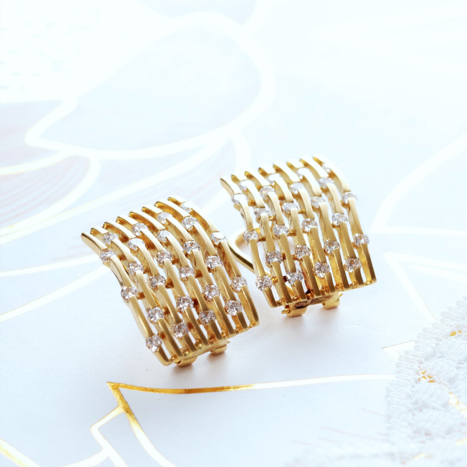 DESCRIPTION: A pair of vintage 18ct yellow Gold designer earrings created circa 1970's to match our pendant. The front surface of the earrings is mattified and each is set with 24 top quality Brilliant-cut Diamonds. The fittings are nice and secure with flip-up safety backs.