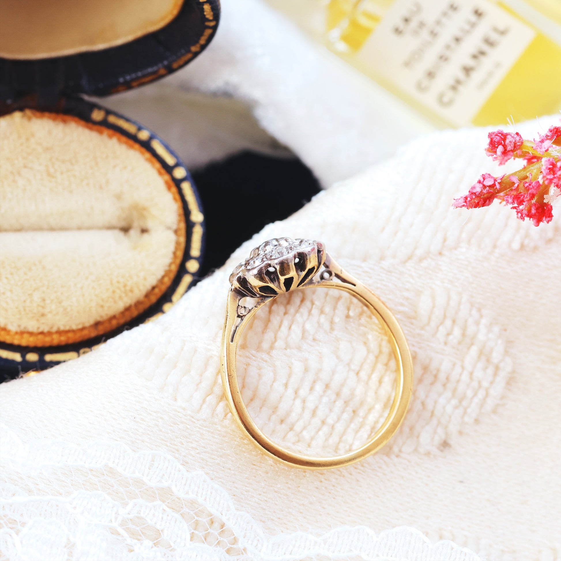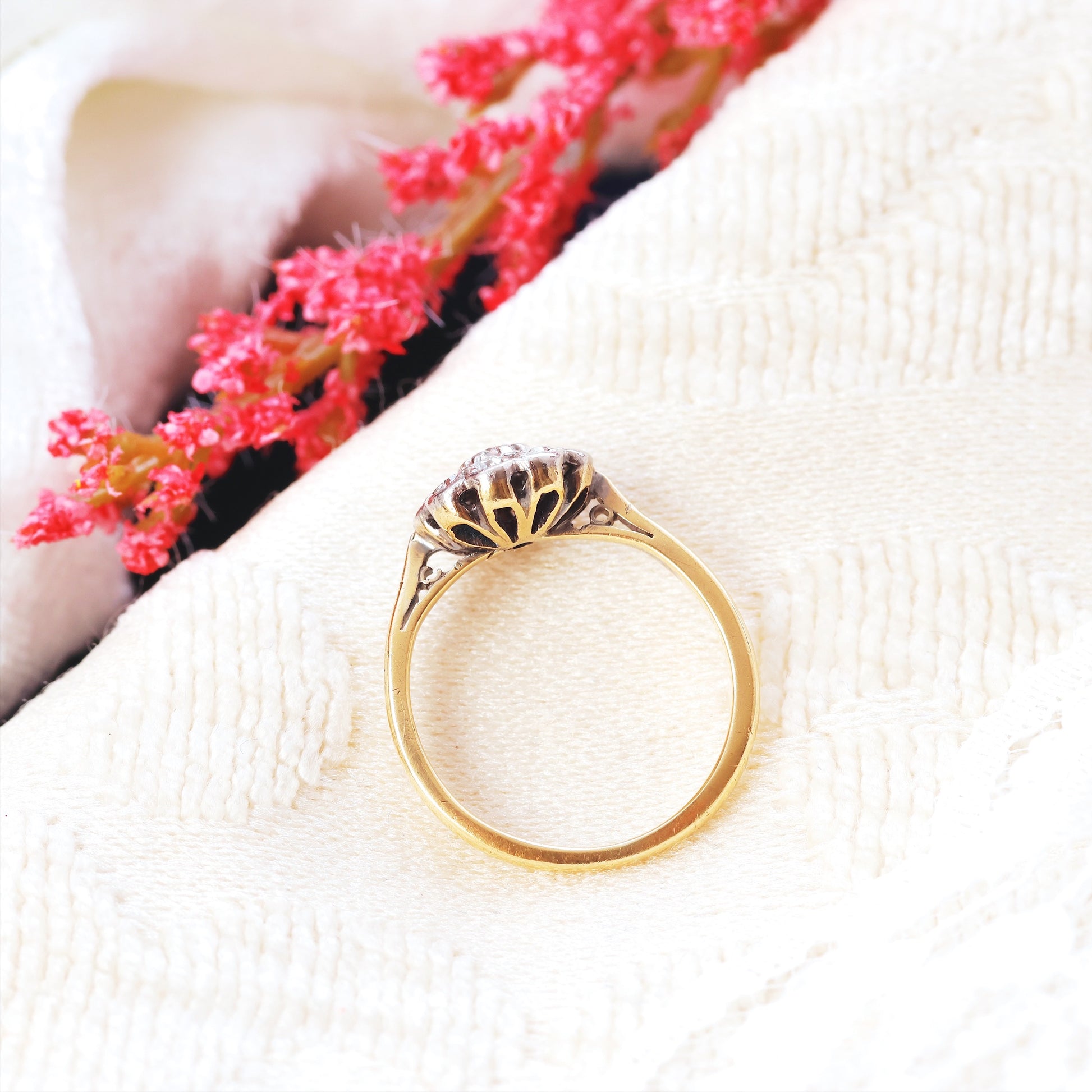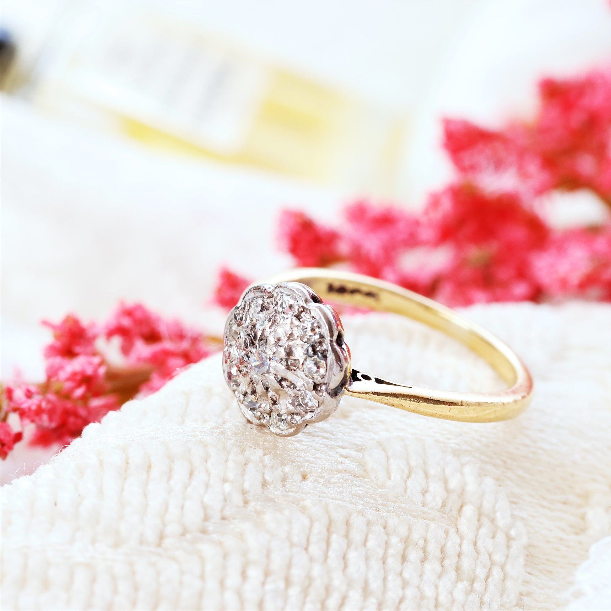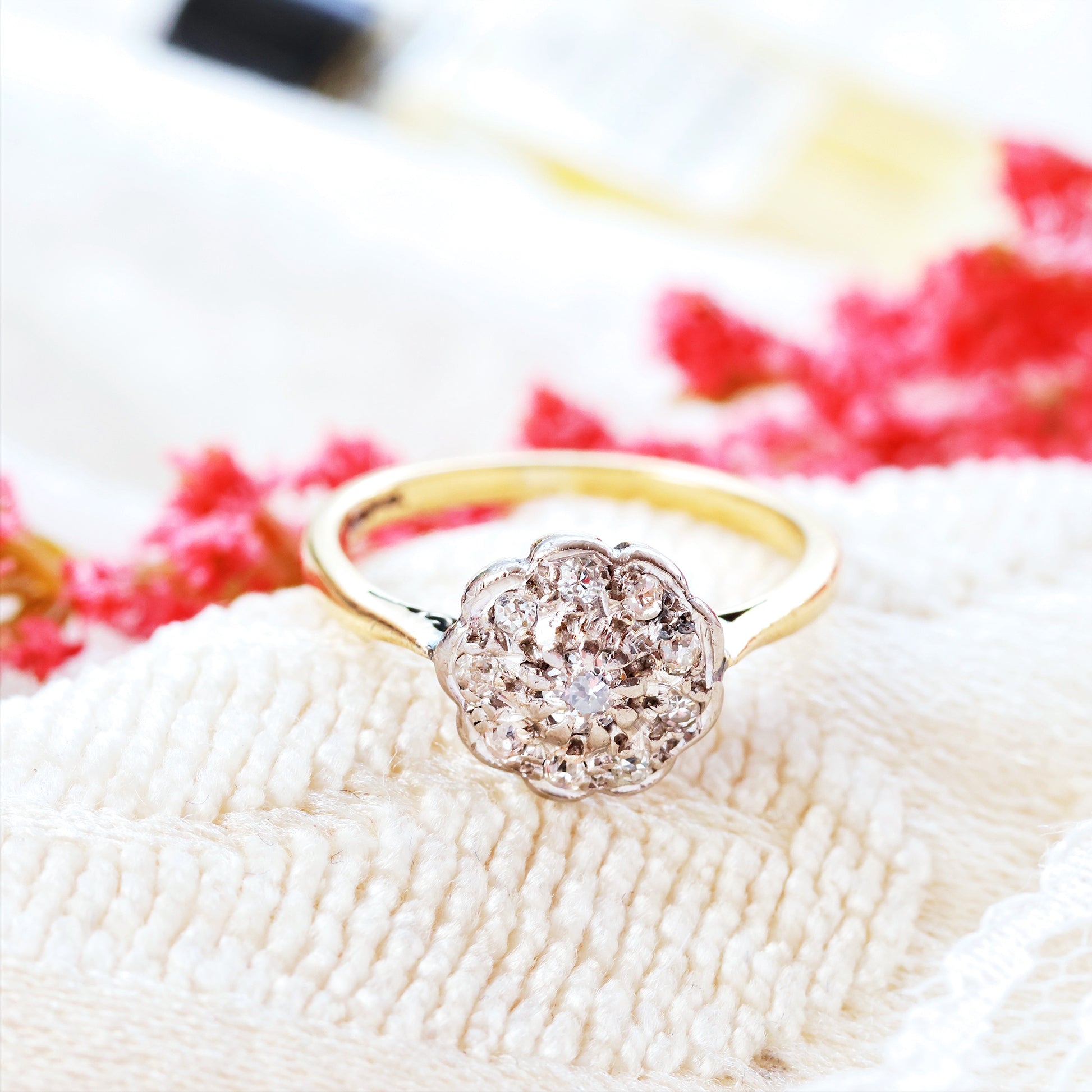 DESCRIPTION: Prettily floral, a vintage 1960’s Diamond cluster ring set with old hand-cut diamonds. This ring is delicate in it's beauty, making it perfect for everyday wear, or as a special piece.