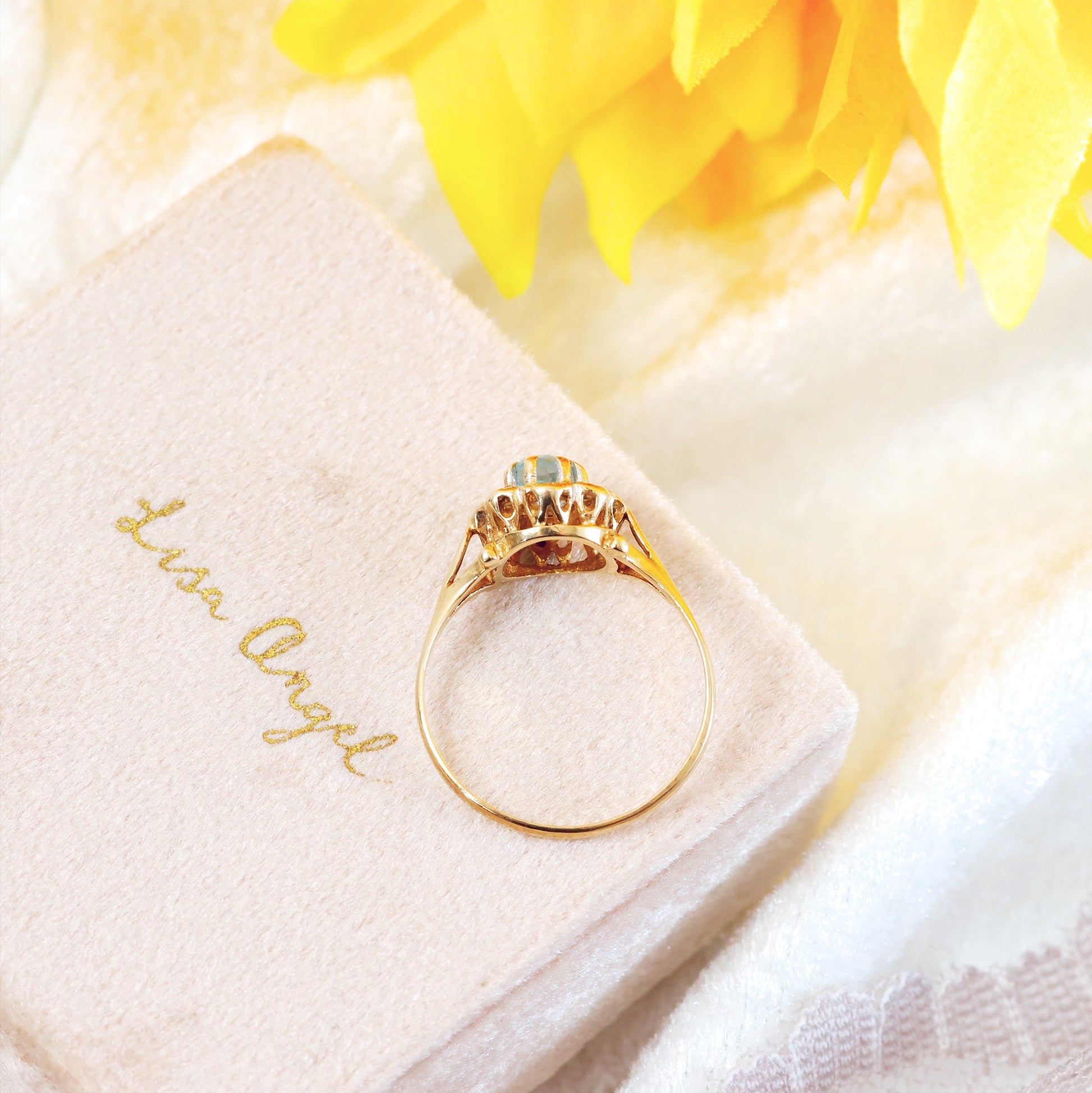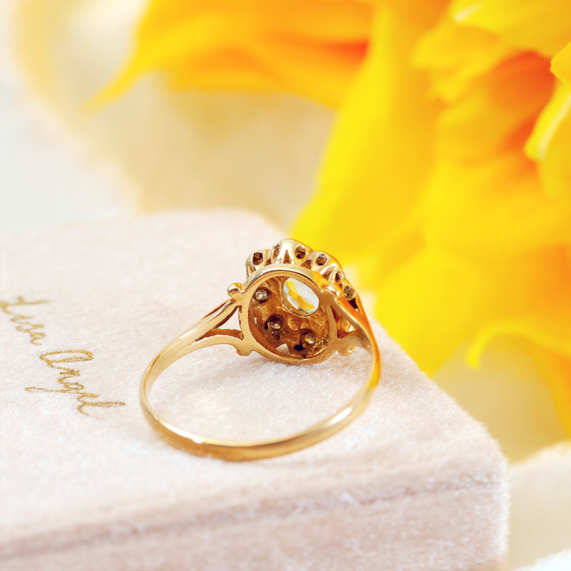 DESCRIPTION: A dainty vintage flower cluster ring set with a pale Aquamarine with eight tiny Diamonds to the petals and with extra details to shoulders where they reach the band. Really cute. In 9ct yellow Gold which is hallmarked for 1990 inside the band.