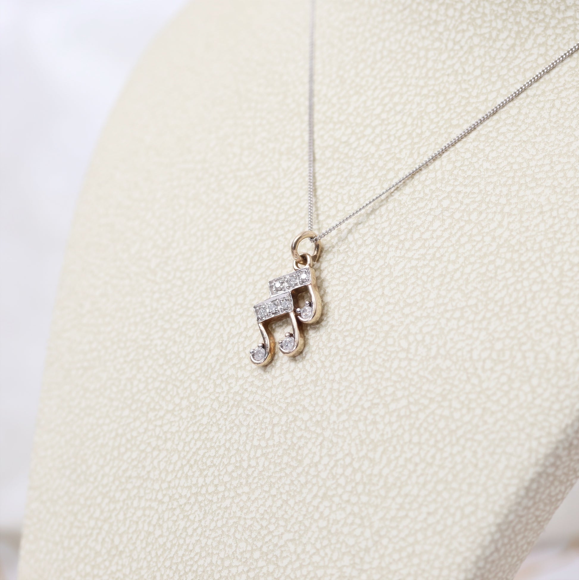 DESCRIPTION: The perfect present for someone special, a vintage sparkly Diamond musical notes charm necklace. In two colours of 9ct Gold and presented on a fine 9ct white Gold trace chain measuring 18 inches and set with nine tiny Diamonds, all is very cute.